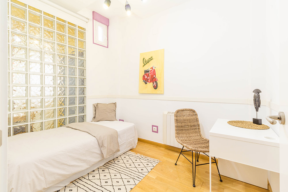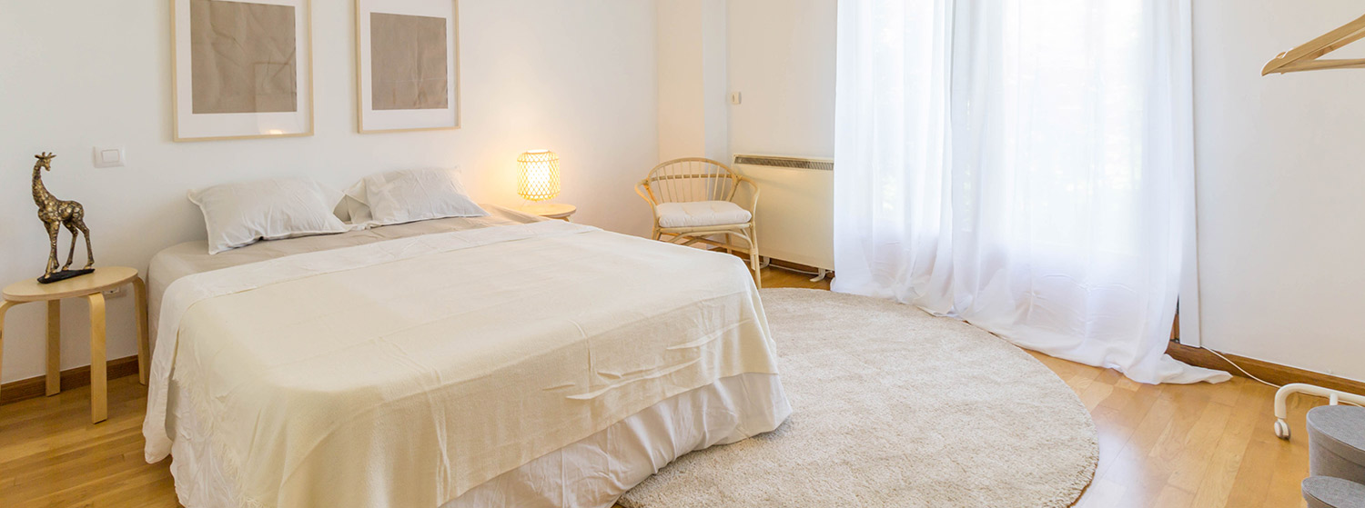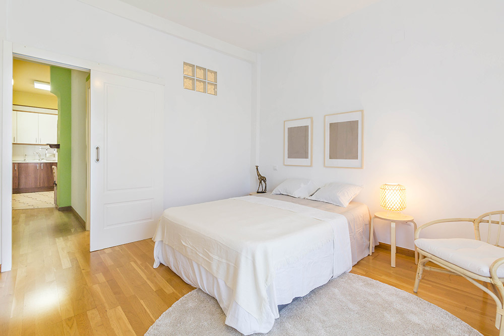 En cuanto a los dormitorios, de nuevo la primera tarea fue pintar de blanco paredes que estaban pintadas de colores, para de esta manera resaltar mejor la amplitud de las estancias que además tienen techos altos. Vestir los dormitorios con camas, ropa de cama, alfombras, decoración… grandes cortinas que vistan los grandes balconadas de la vivienda.