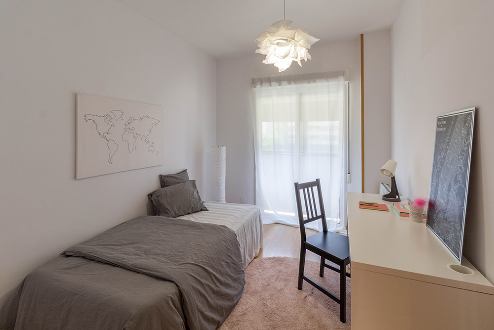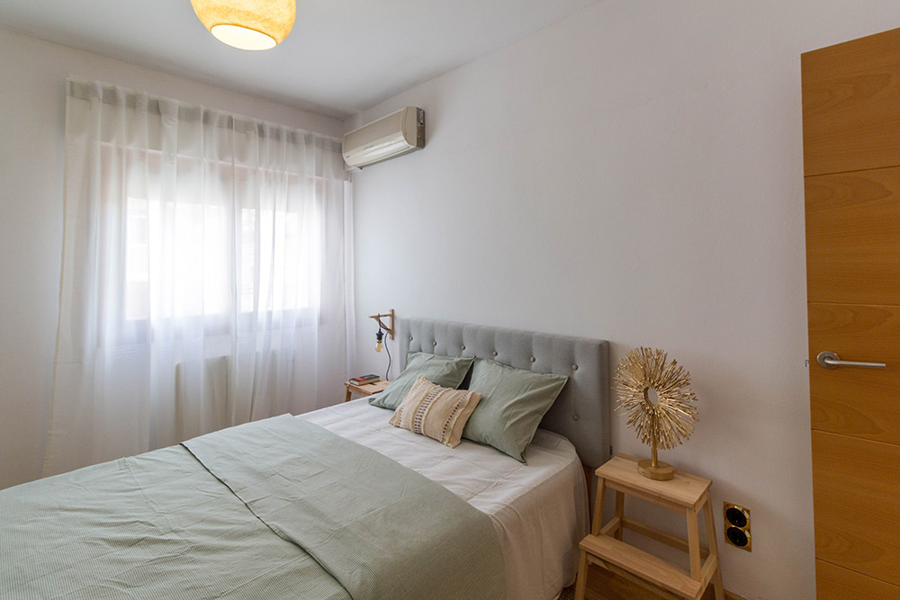 En el dormitorio principal, una cama bien vestida, unas mesillas sugerentes y la gran cantidad de luz que viste todo. Y en el dormitorio secundario una cama, acompañada de un escritorio blanco.