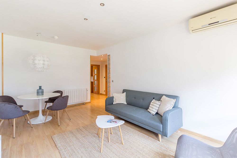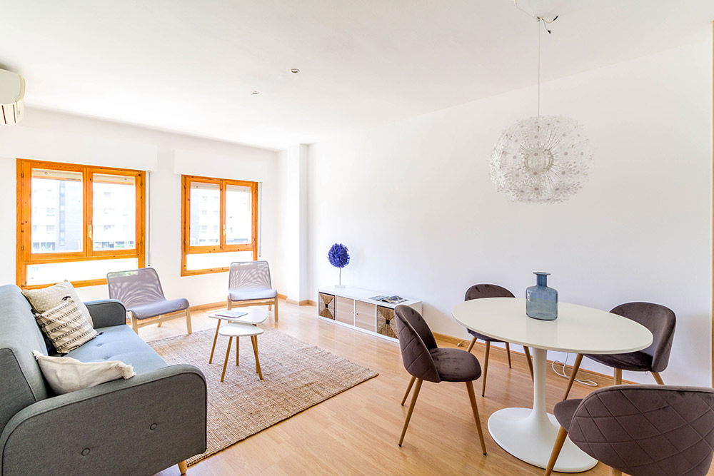 En el salón, una gran mesa redonda y blanca con 4 sillas modernas justo debajo de una gran lámpara sería la primera imagen que recibirían los clientes al entrar en la vivienda. Sumamos texturas con alfombras, cojines y algo de decoración y quedó un salón realmente bonito.