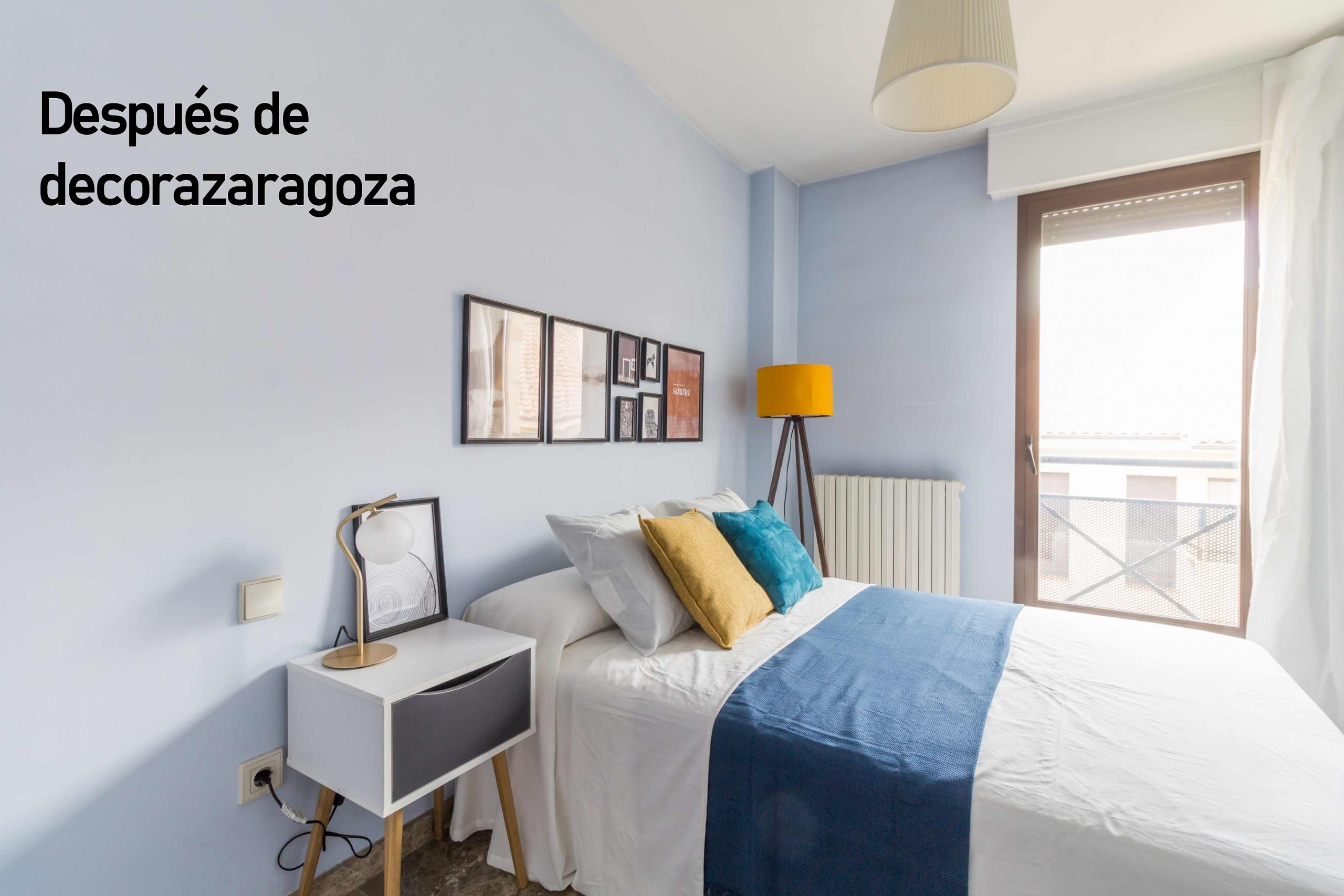 El dormitorio, cambiamos las mesillas que había por una mesilla blanca, gris y con patas de madera y por una lampara alta de trípode con pantalla amarilla que resaltasen sobre el fondo azul de la pared. y unos cuadros a modo de cabecero sumado a un buen número de cojines.